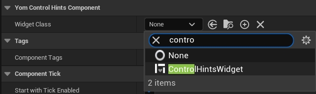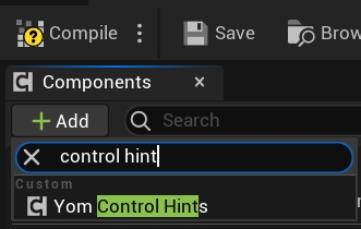 YomControlHints is a component therefore we need to add it to the player blueprint. To add the component you will have to click add on component menu and search for Yom Control Hints